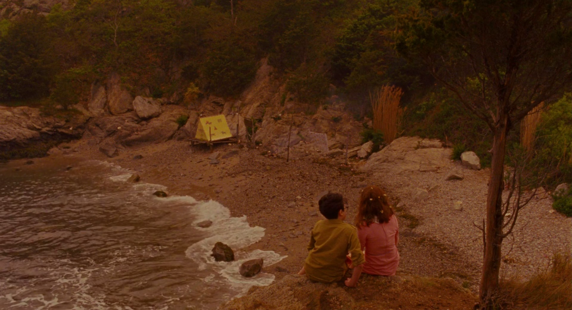 In building up the island of New Penzance, Anderson builds a locale where even the tempest of a hurricane can feel perfect. The rocks on the beach all feel like they have a pattern, though there doesn’t seem to be anything specific to define that. Camp Ivanhoe (from whence Sam flees) has an organized chaos that feels like a perfectly controlled environment. Even the forests the children run through have a perfect framing to them.