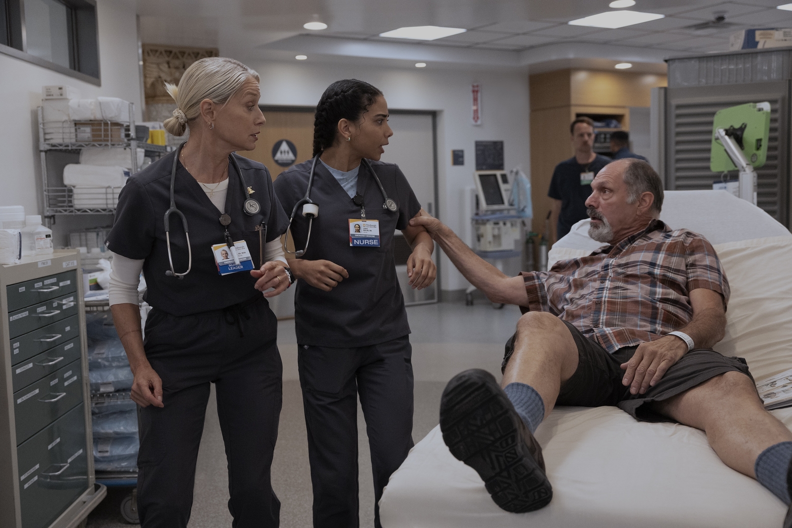 Six hours in, this is all the Dana we’ve been wanting for the past several episodes. We finally get an answer about what happened with the guy who assaulted her last season (arrested, but Dana didn’t press charges) and she squares things with Langdon (mirroring their interaction in the first season’s finale when he tried to excuse away his addiction). We also get her ranting about the donuts admin sent down. “Admin’s blood pastries” she calls them (incredible line) and then later rips down one of those emotional posters that replaces quality of life (increased pay, more nurses on the floor) with empty words as graphic design. There’s still other mysteries. Emma asks her “why do you keep coming back?” Dana doesn’t answer. The closest we get is her telling Langdon she “got bored”, but it feels like there’s so much more to learn.