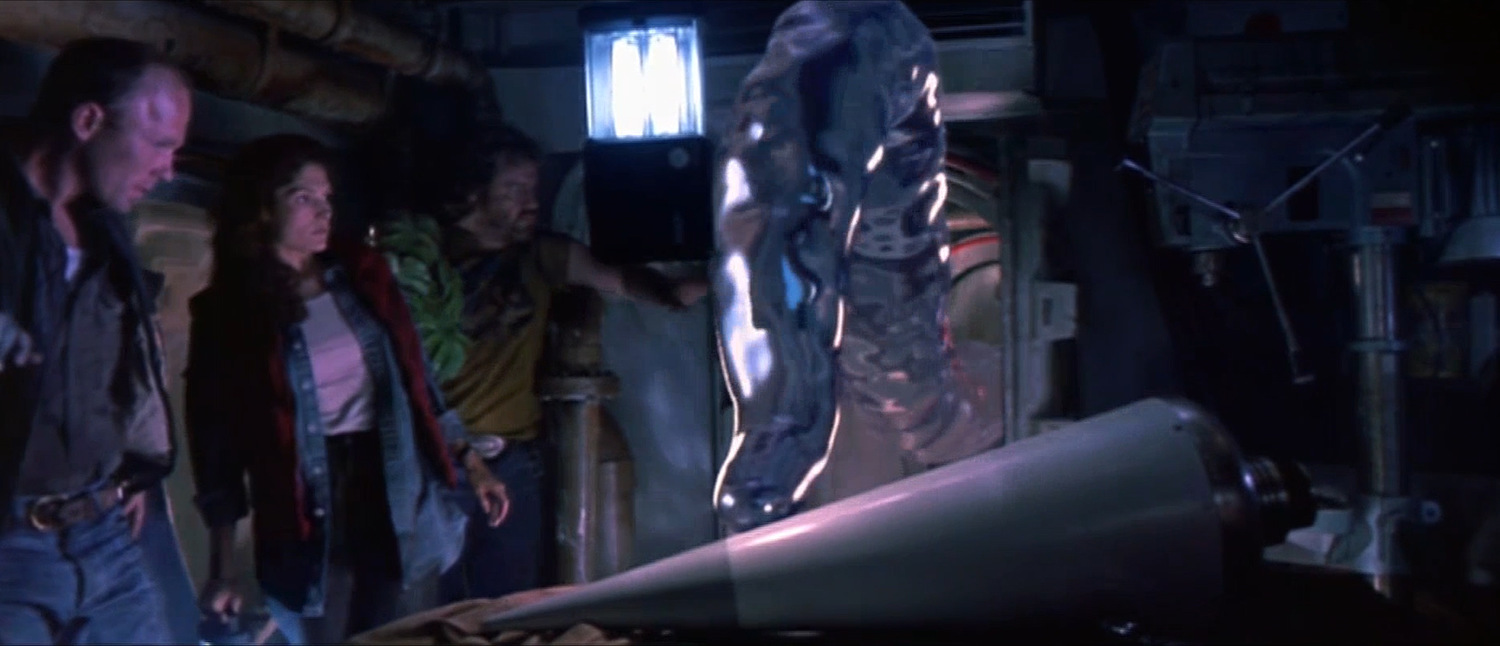 But when shit goes down and the umbilical pulls the crane down to the ocean floor, it causes disaster on the rig. Explosions, mass flooding, chaos. And thank god Bud loves Lindsey, because the band on his finger stops a closing pressure door from sealing him into a watery tomb. It feels like a total cliche, The Abyss’s equivalent to a book stopping a bullet. But that love literally saves his life, just like it will save his life when the aliens read his message, just like it will save Lindsey when she’s in the dire throes of fatal hypothermia. It so should not work. But Cameron puts such passion into the sentiment that the heart aches.