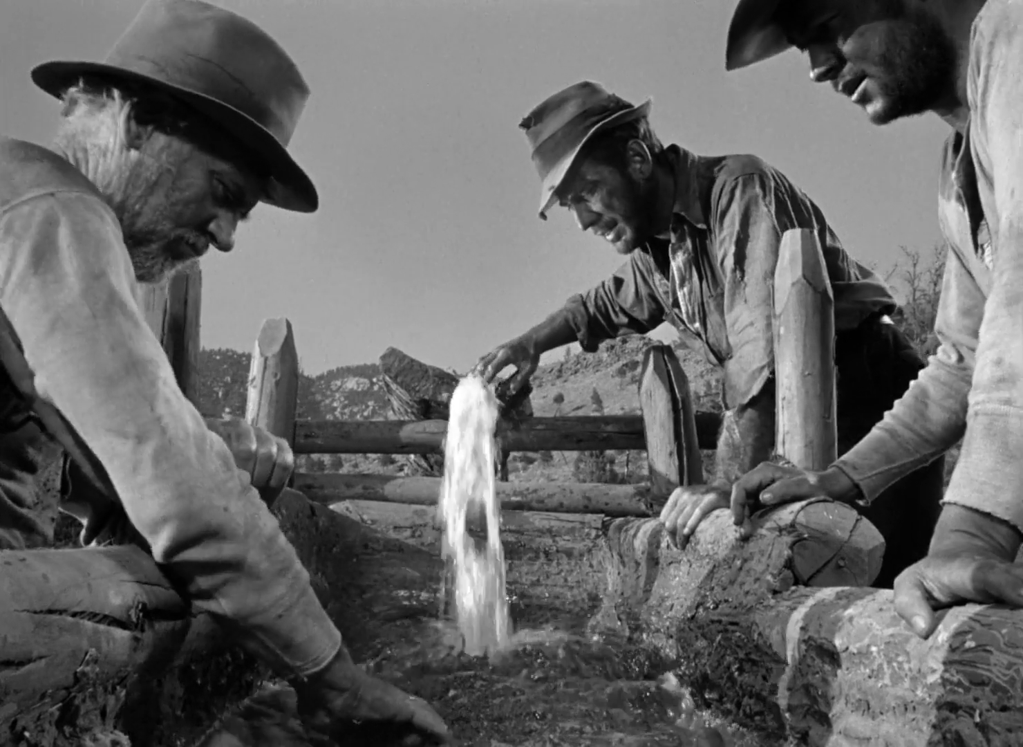 But seeing him in Sierra Madre is so unusual. He’s a vagrant, a beggar. At one point early he cleans up at a barbershop, but no sooner has he combed his hair than he’s begging a rich dude for the third time that day. Eventually, he finds work (and a friend in Curtin) doing day labor on an oil derrick, but the rich overseer scams him out of money and runs away, leaving him again broke and scrambling for cash.