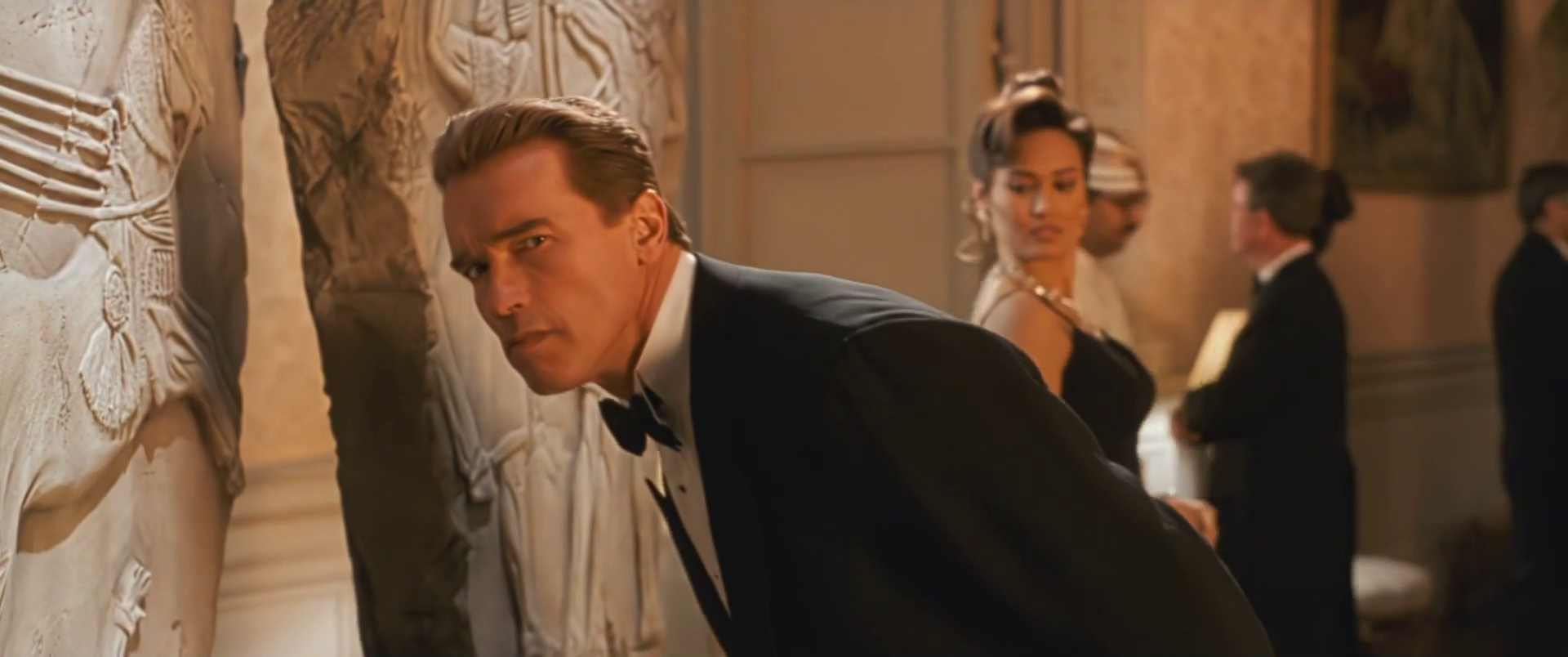 Unlike Aliens or The Abyss, this isn’t Cameron shivving military meatheads. This isn’t the anti-police subtext in both Terminator films. True Lies has Arnold happily working for a super secret government organization. The biggest critique about that institution is the way he spends government money and resources to shore up the weaknesses in his marriage. He stalks and destroys Bill Paxton’s con job. He uses a government facility to put his wife through an interrogation about her possible infidelity. He books them a luxury suite at a fancy hotel so she can give him a striptease.